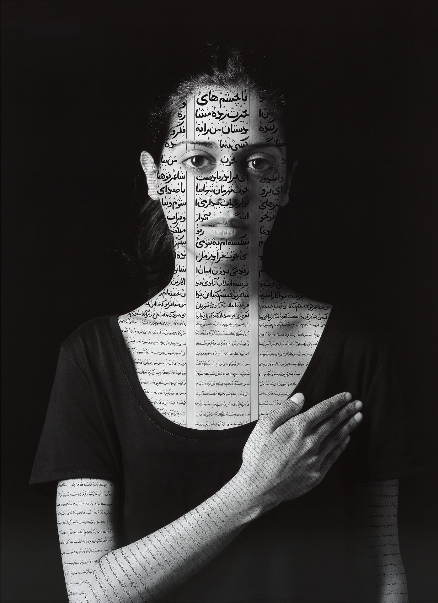 Written Pictures will begin by looking at the ways lens-based artists employ text in their work. This will include a survey of photographers like Barbara Kruger and Shirin Neshat, who overlay text on their images to make pointed social critique; Duane Michals, whose handwritten texts weave together his photographs into whimsical and philosophical narratives; and Bernard Faucon, who inserts three-dimensional text sculptures into landscapes and, at other times, writes directly on his subjects.